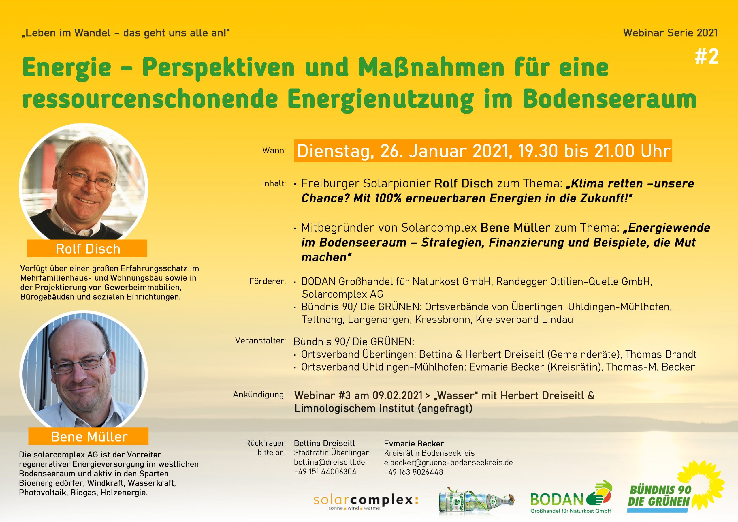 Als Referenten spra­chen der Freiburger Solarpionier Rolf Disch zum Thema: „Klimaretten – Last oder Chance? Mit 100% erneu­er­ba­ren Energien in die Zukunft!“ und der Mitbegründer von Solarcomplex Bene Müller zum Thema: „Energiewende im Bodenseeraum – Strategien, Finanzierung und Beispiele, die Mut machen“.