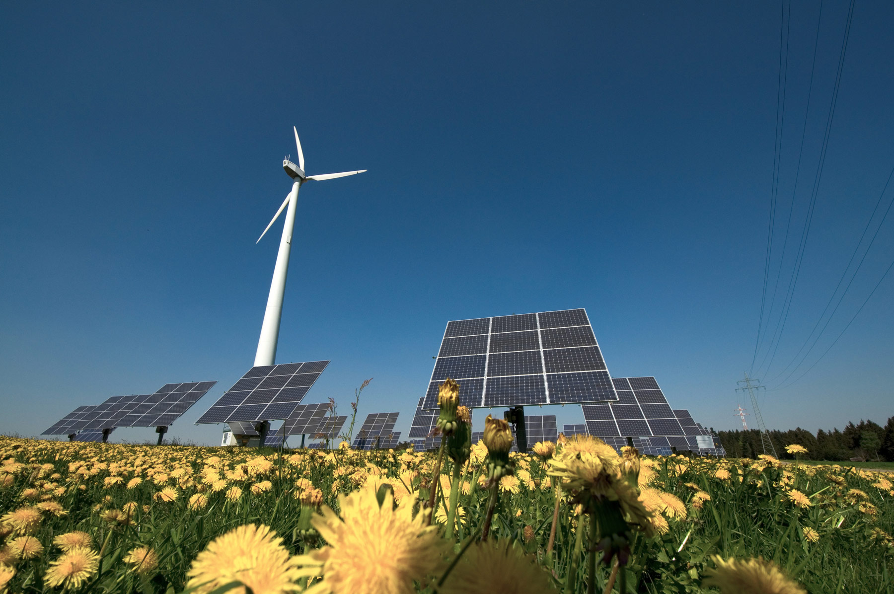 Das Foto zeigt ein Windrad, Solarpanele und blühende Blumen